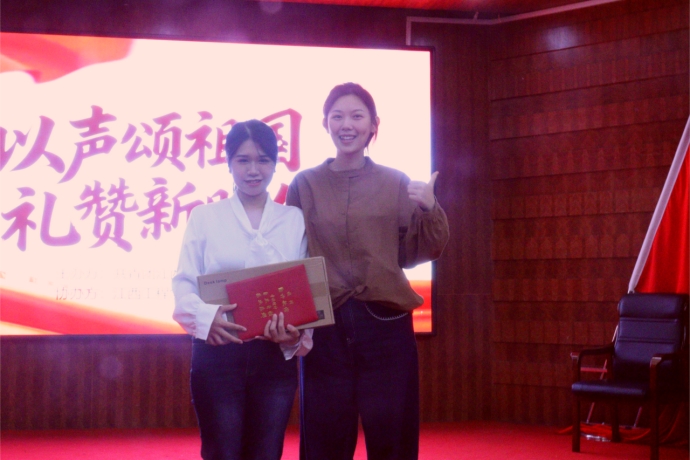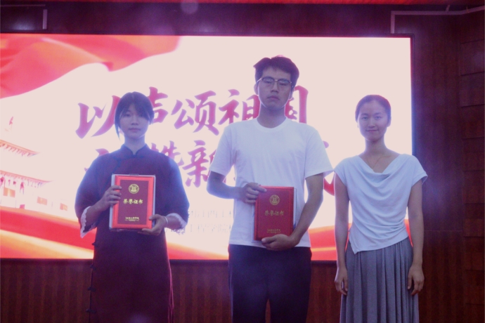 经过紧张激烈的角逐与评委们的专业评审,本次比赛的获奖名单终于在万众期待中揭晓。李萌凭借极具感染力的演绎与深刻的情感共鸣,脱颖而出斩获一等奖;昌鑫之声以默契的团队配合与富有张力的表现,荣获二等奖;熊康明则以沉稳的台风与扎实的功底,拿下三等奖。此外,杨皓然、梅宇帆也凭借出色的发挥,获得优秀奖。当获奖选手依次走上舞台,接过荣誉证书的那一刻,台下响起了最热烈的掌声,这既是对他们努力与实力的肯定,更是对他们“以声颂祖国” 这份热爱的最高致敬。