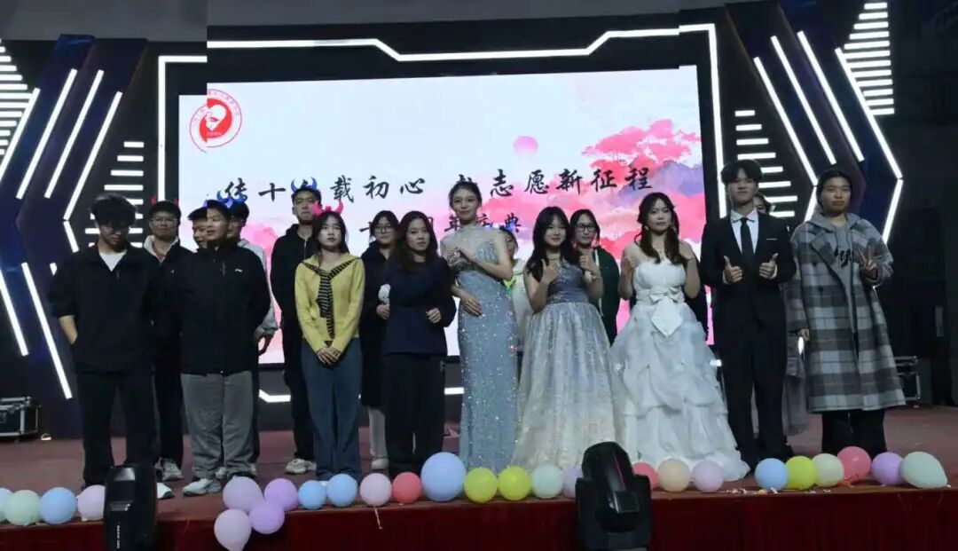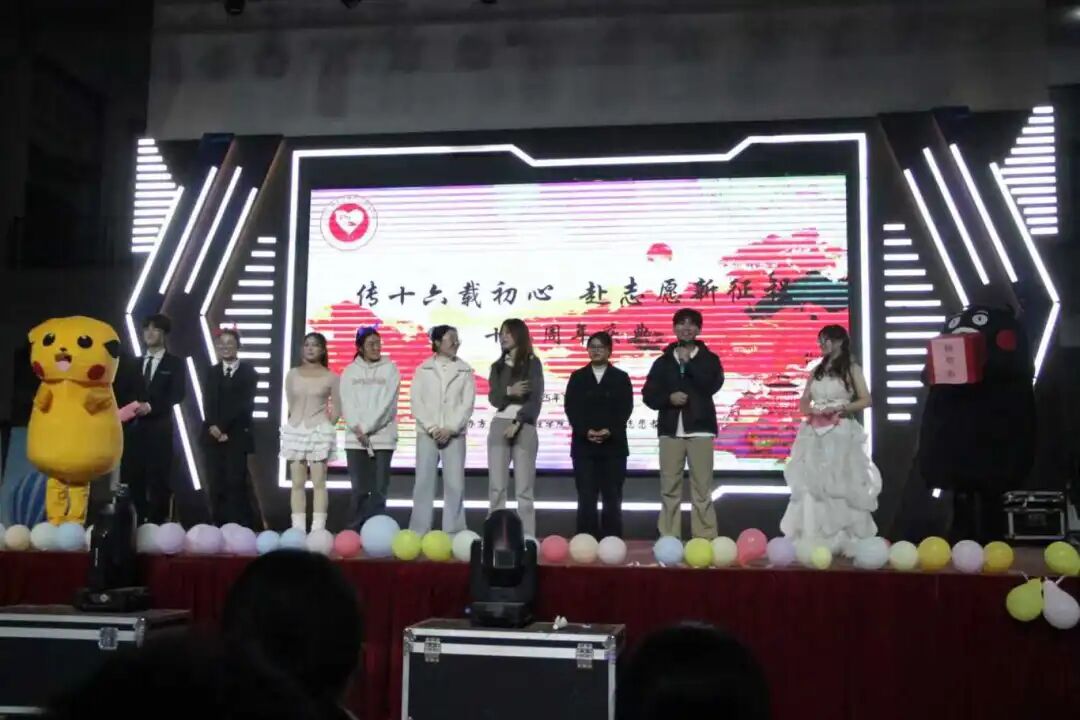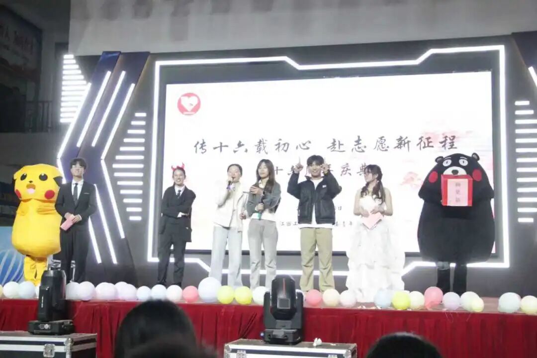 动感音乐响起,每一段旋律都让全场沸腾起来。随着主持人宣布十六周年庆典正式开始,礼炮齐鸣,彩纸在空中打着旋儿飞舞,共庆这一美好时刻。随后,屏幕上播放起往届学长学姐的美好祝福视频,温暖的声音透过音响传递到每个人心中,泛起阵阵暖意。本次周年庆盛情邀请到新余学院、赣西科技职业学院、江西冶金职业技术学院、江西新能源科技职业学院的青年志愿者协会代表,以及学校各分院、校级组织、社团的主席代表,各方宾朋齐聚一堂,共同见证这场青春盛会。