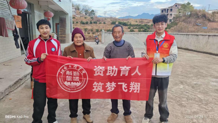 我是江西工程学院智慧产业学院的何程龙,在2026年寒假期间,很荣幸担任学校“学生资助宣传大使”的其中一员。我始终牢记资助育人使命,带着责任、真诚与担当回到家乡,主动将国家与学校的资助政策送到有需要的家庭,用心用情帮助更多学子知晓政策、安心求学、顺利完成学业。