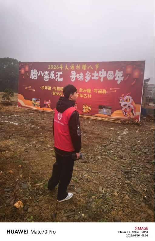 活动期间,正逢村里举办“腊八喜乐汇寻味乡土中国年”。清晨的大源村薄雾缭绕,我便穿上红马甲,来到村党群服务中心,参与到活动的筹备中。挂灯笼、摆桌椅、为老人和孩子端上一碗碗热腾腾的腊八粥……每一个细节都让我体会到浓浓的节日气氛,也让我重新感受到家乡独有的温暖与厚实。