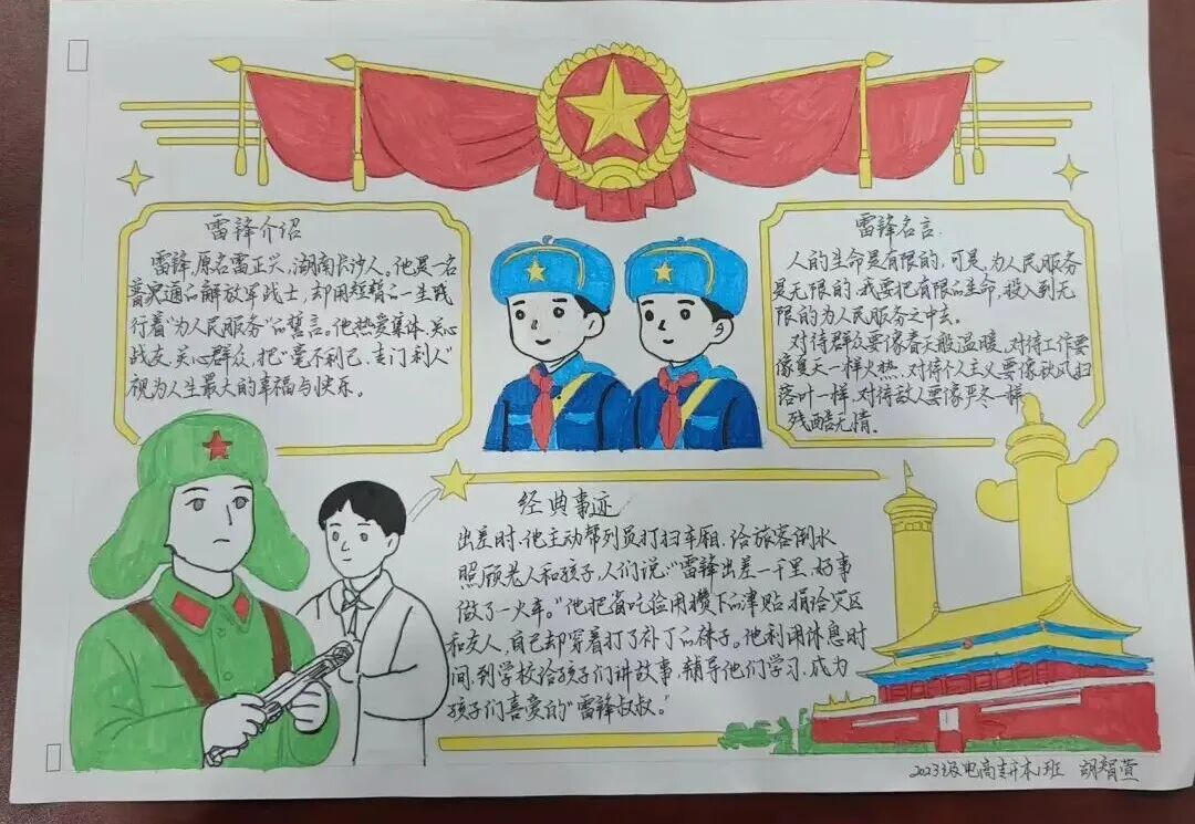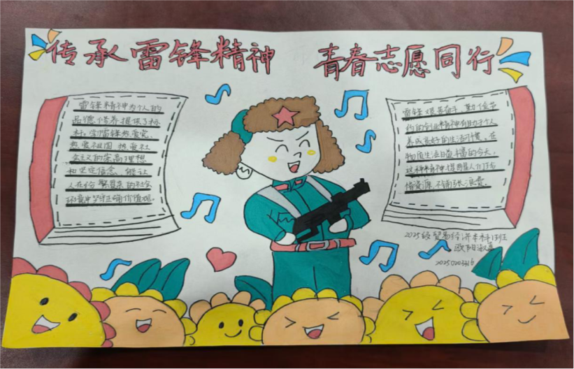 活动期间,学院各班级同学积极响应、踊跃参与,以笔墨为载体、以色彩为语言,将对雷锋精神的理解与感悟融入一幅幅生动的手抄报作品中。同学们精心设计版面,或描绘雷锋同志的光辉形象,或摘录雷锋日记中的温暖字句,或书写新时代雷锋故事,用细腻的笔触和巧妙的构思,展现出雷锋精神的丰富内涵与时代价值。