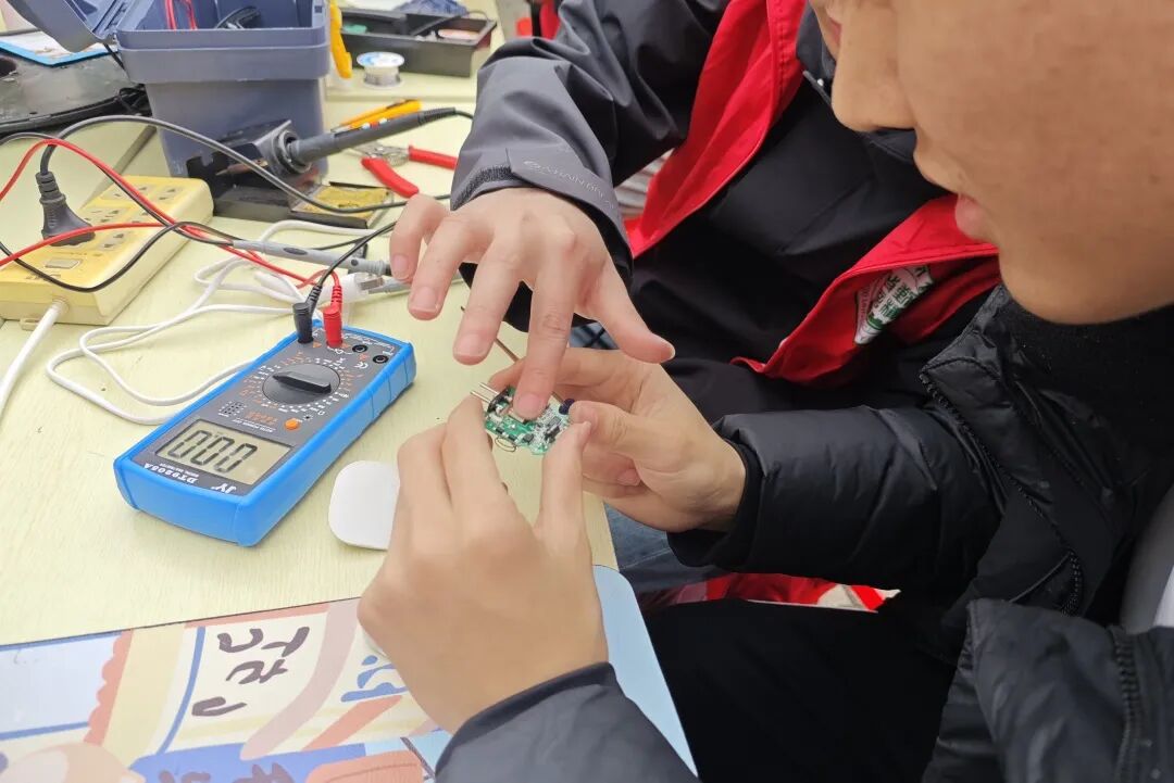 活动现场暖意融融,居民们纷纷带来家中故障的台灯、吹风机、电热水壶、插线板、收音机等小家电。学生排查电路、检测元件、分析故障,从拆解、焊接到调试、组装,每一步都严谨细致、精益求精。师生协作配合,高效解决了多项家电维修难题。