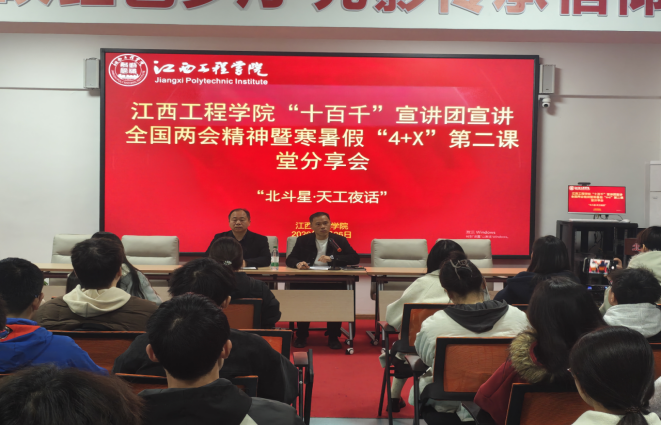 2026年3月26日晚,江西工程学院举办“北斗星·天工夜话”专题活动,本次活动以宣讲全国两会精神暨寒暑假“4+X”第二课堂分享会为主题。电子信息工程学院积极组织学生参加本次活动,本次讲座围绕两会热点与青年使命展开深入解读。