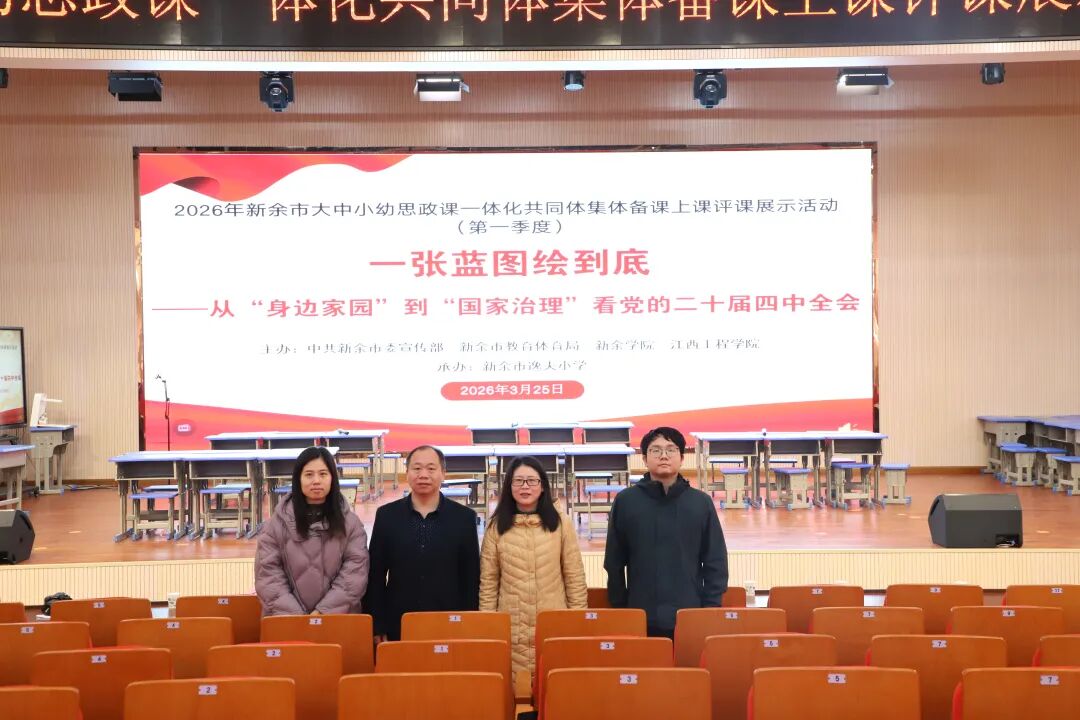 为深入贯彻《教育强国建设规划纲要(2024-2035年)》精神,扎实推进新余市大中小幼思政课一体化建设,2026年3月25日,由中共新余市委宣传部、新余市教育体育局、新余学院、江西工程学院联合主办的2026年全市大中小幼思政课一体化共同体集体备课、上课、评课活动在市逸夫小学正式启幕。作为主办方之一,江西工程学院高度重视此次活动,组织马克思主义学院于永清、黄琴、刘丽、周理斌四位思政课教师全程参与,与全市四百余名思政教育工作者齐聚一堂,共商思政育人协同路径。