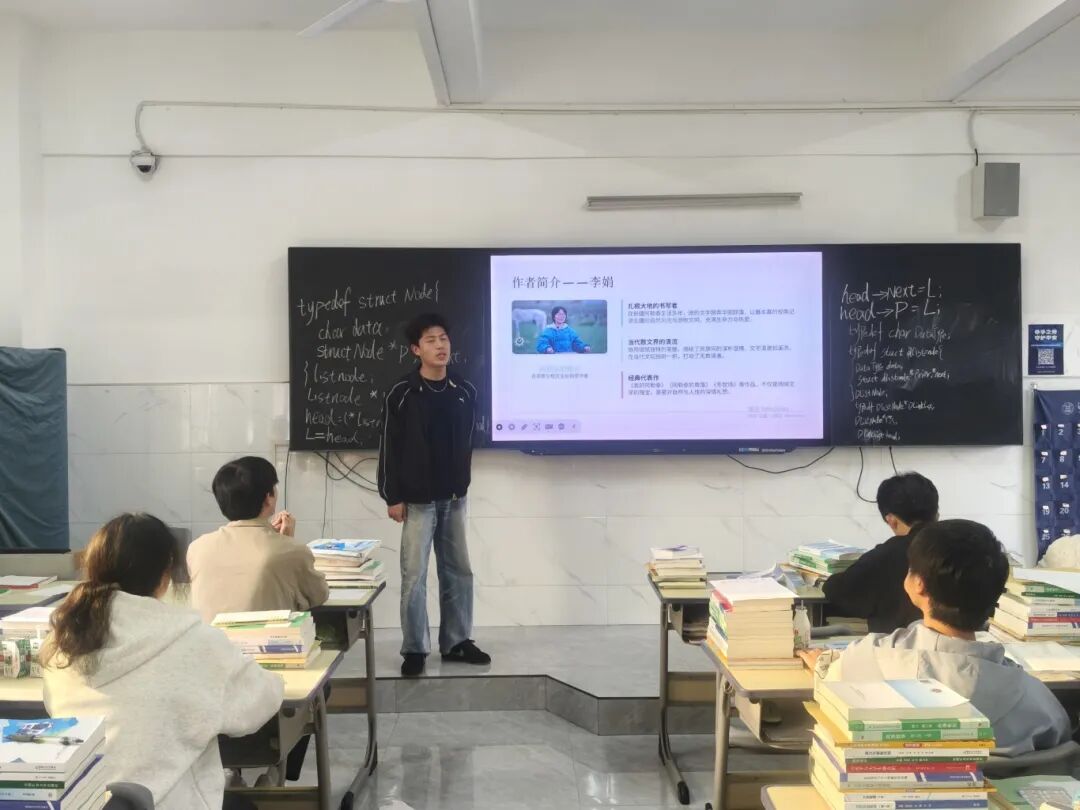 2025级软件工程本科2班陈博文同学则以《创业史》为主题,他结合20世纪50年代农业合作化运动的时代背景,解读梁生宝带领群众谋发展的奋斗历程。他从小说的时代内涵与人物精神切入,剖析创业初心与思想转变,阐释艰苦奋斗、勇于担当的时代精神,结合当下学子成长实际,鼓励大家传承拼搏精神,以实干扛起责任,在学业与生活中勇毅前行。