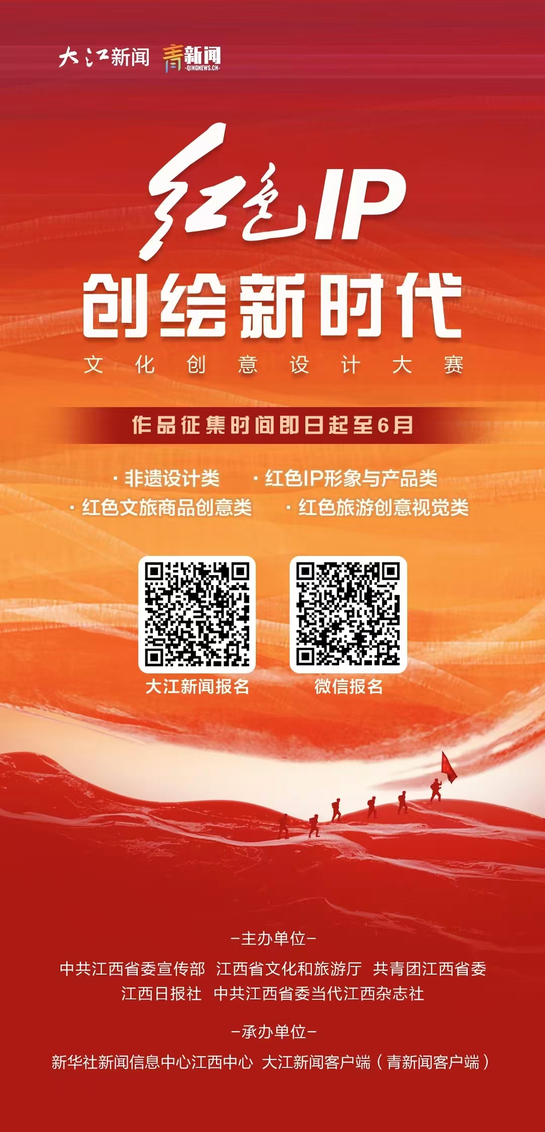 即日起,由中共江西省委宣传部、江西省文化和旅游厅、共青团江西省委、江西日报社、中共江西省委当代江西杂志社共同主办,新华社新闻信息中心江西中心、大江新闻客户端、青新闻客户端承办的“红色IP·创绘新时代”文化创意设计大赛正式启动,面向全国青年发出诚挚邀约。