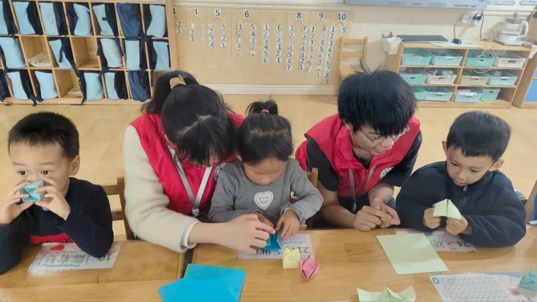 彩纸在指尖翻转,桌面上渐渐摆满了一个又一个动人独特的手工作品。活动伊始,志愿者们用有趣的语言对小朋友们讲解了王冠的制作技巧。随后,志愿者们和小朋友们组成一对对温馨搭档,志愿者们手把手教小朋友们折纸,小朋友们双眼紧紧盯着志愿者们飞舞的手。当一个个作品出现在眼前时,空气中也弥漫着欢乐的气息,教室内满是欢声笑语。