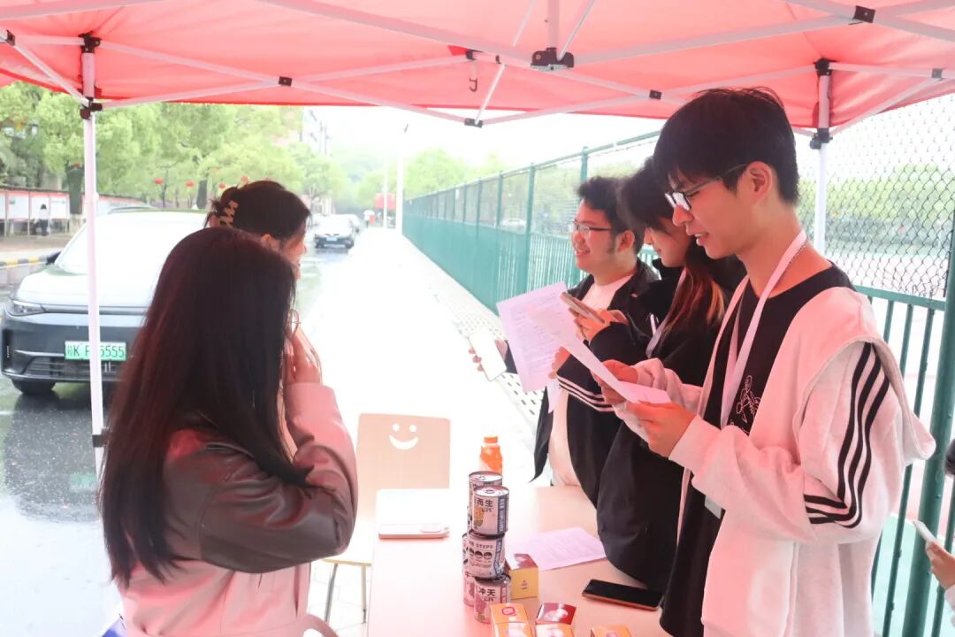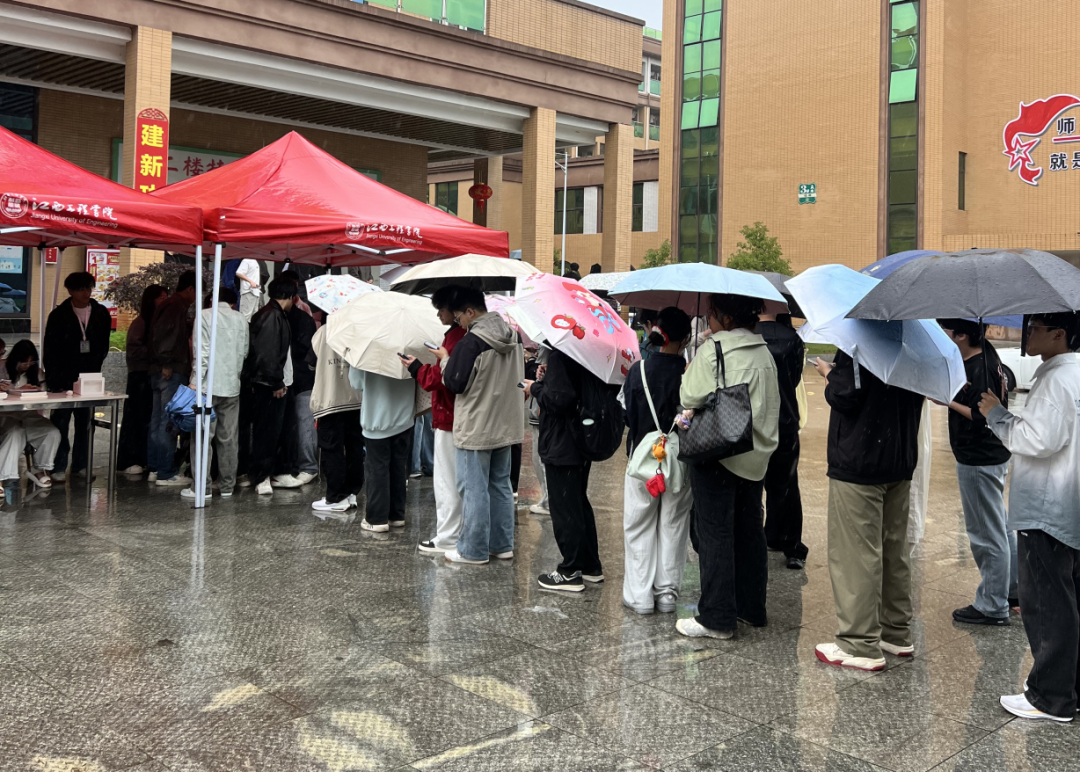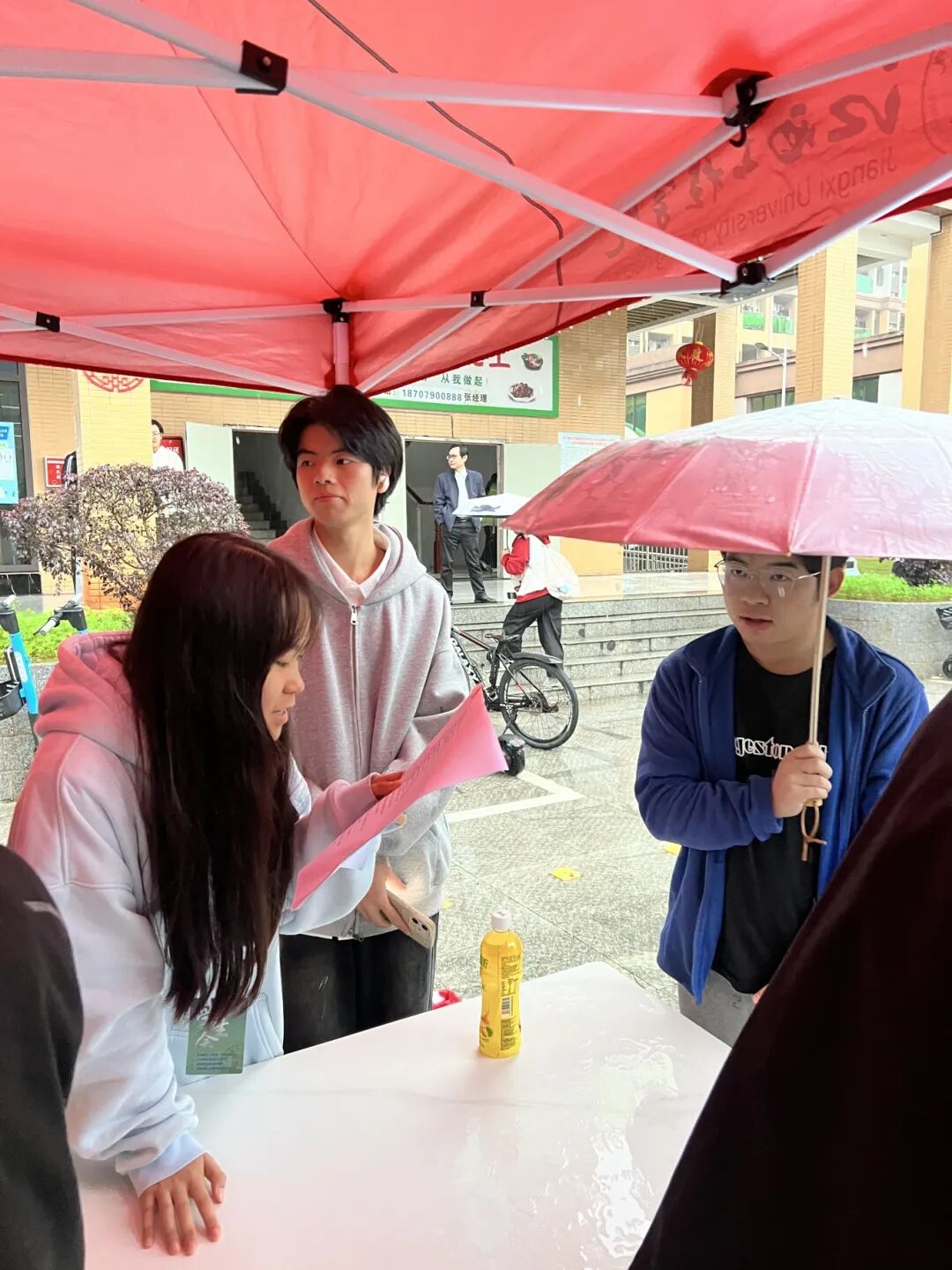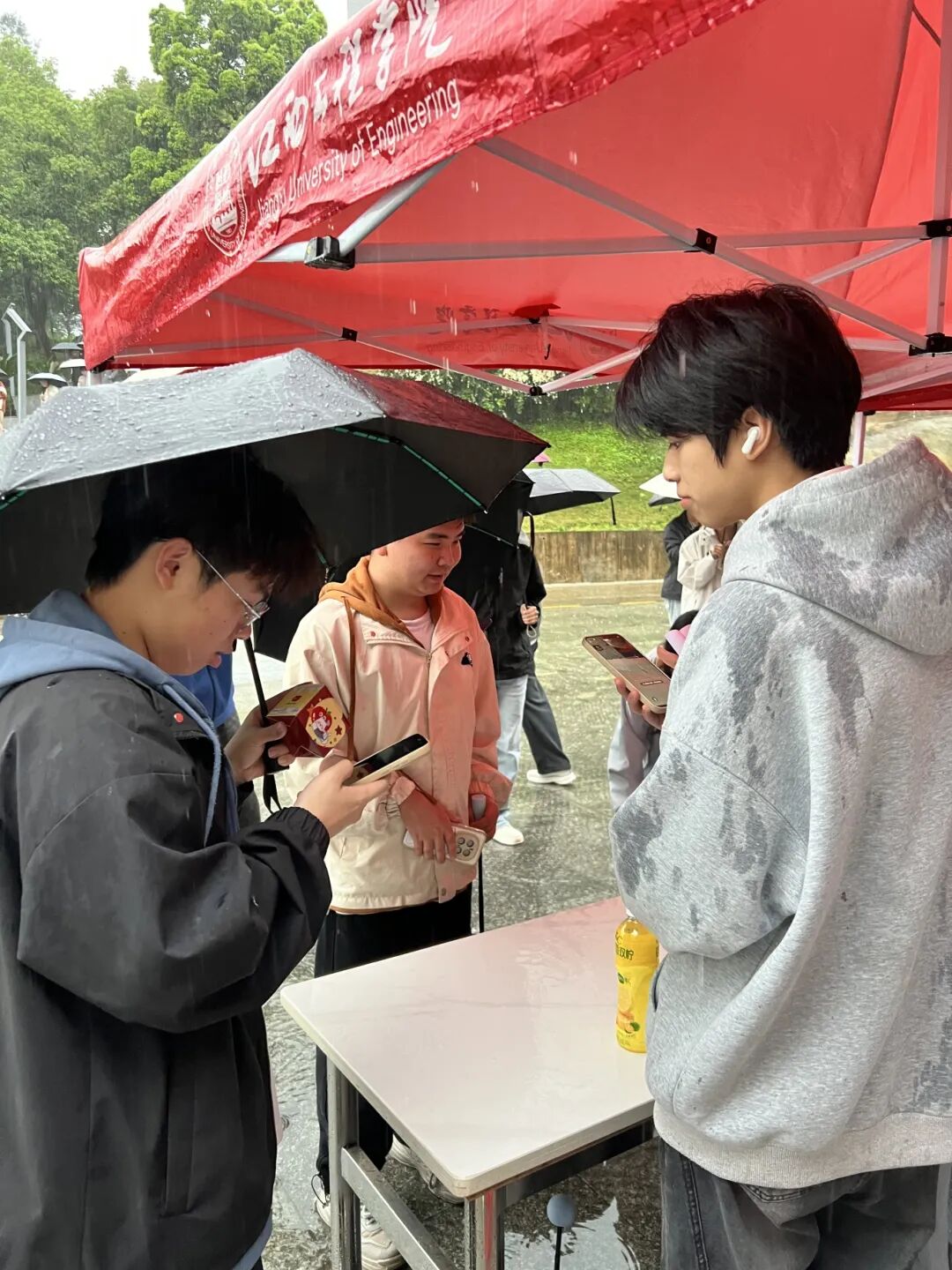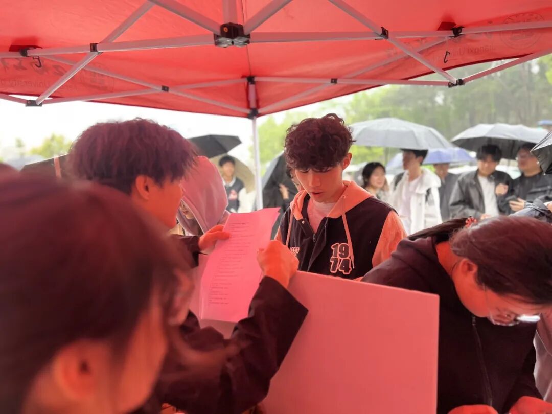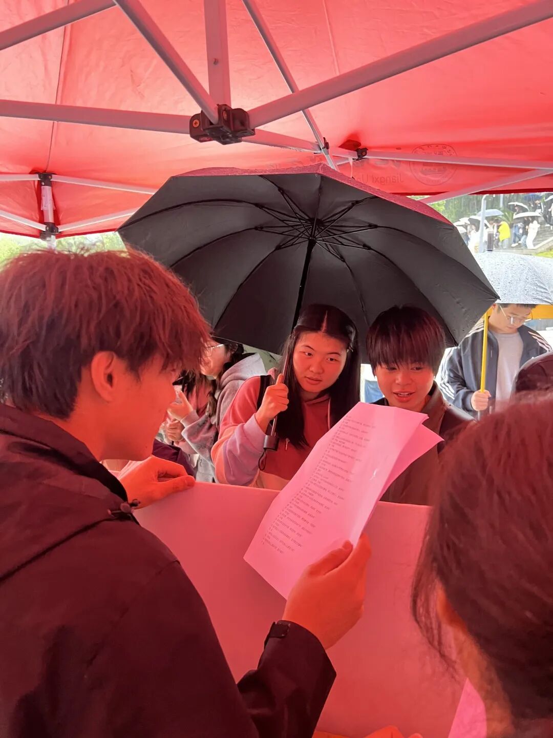 另一边的仙女湖校区,同样是一派火热景象。哪怕天空飘着细雨,也丝毫没有浇灭大家的参与热情,队伍从帐篷下一直延伸到路边,同学们撑着各色雨伞,哪怕地面湿滑,也挡不住大家学习的热情。