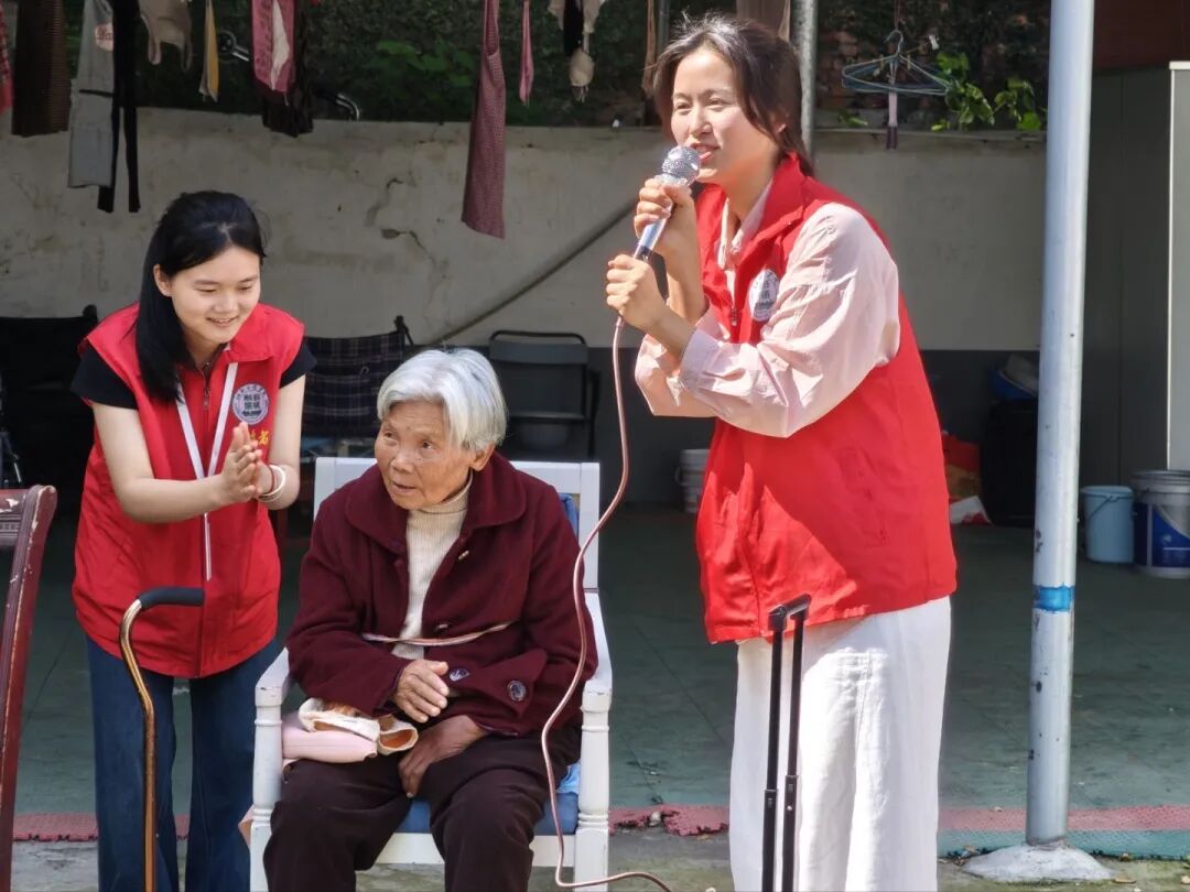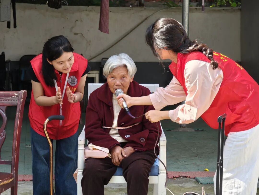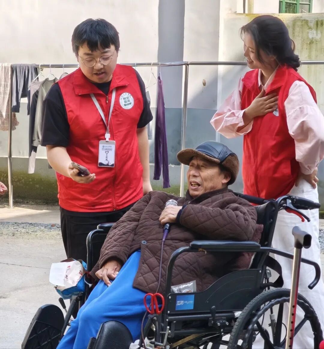 游戏结束后,悠扬的歌声在院子里响起。志愿者、敬老院院长和老人们围坐在一起,开启了温馨的合唱环节。一首首经典老歌被大家共同唱响。院长带头高歌,志愿者们放声合唱,老人们也忍不住跟着哼唱,有的甚至站起来拿着话筒献唱一曲。歌声里没有年龄的代沟,只有跨越时光的共鸣。温暖的旋律在庭院上空回荡,每个人的脸上都洋溢着幸福的笑容。